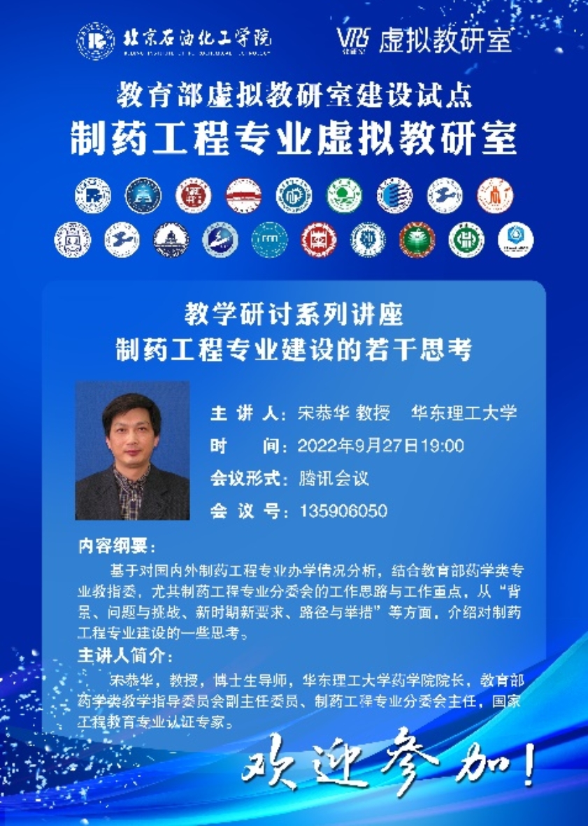 為貫徹落實教育部《關(guān)于加快推進虛擬教研室試點建設(shè)工作的通知》的工作要求,由北京石油化工學(xué)院牽頭的制藥工程專業(yè)虛擬教研室在前期工作的基礎(chǔ)上組織開展系列教學(xué)研討活動。2022年9月27日,制藥工程專業(yè)虛擬教研室組織首場專業(yè)建設(shè)教學(xué)研討會,由虛擬教研室專家委員會主任、教育部高等學(xué)校藥學(xué)類專業(yè)教學(xué)指導(dǎo)委員會副主任委員、華東理工大學(xué)藥學(xué)院院長宋恭華教授以《制藥工程專業(yè)建設(shè)的若干思考》為題作專題報告。