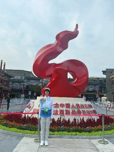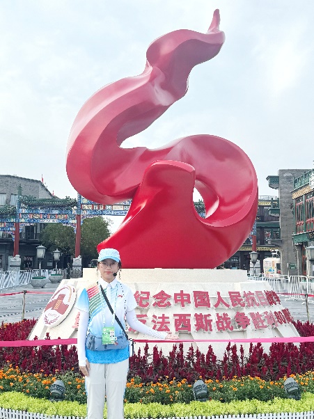 作為前門地鐵站路線引導流動崗的志愿者,在觀禮人員去往觀禮臺的途中迎接他們到來,歡送他們撤離,我深感使命光榮與責任重大。當在工作崗位上聽到80響禮炮響徹云霄,看到先進戰(zhàn)機掠過長空,內心的震撼與自豪難以言表。這次寶貴的經(jīng)歷,是一次把“小我”融入“大我”的親身體驗,是一堂最深刻的“思政課”。我也會將此次經(jīng)歷刻在心中,腳踏實地的學習,弘揚偉大抗戰(zhàn)精神,堅定不移跟黨走,勇?lián)鷷r代使命,以青春之我、奮斗之我,傳承歷史的火炬,譜寫新時代的篇章。