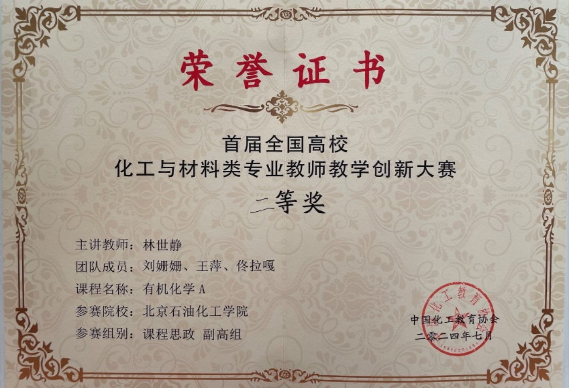 近日,由中國化工教育協會主辦,中國化工教育協會高校工作委員會、北京化工大學承辦的首屆全國高校化工與材料類專業教師教學創新大賽順利落下帷幕。本屆競賽共有北京化工大學、北京理工大學、四川大學、青島科技大學等來自全國的50余所高校的90支參賽隊伍角逐。經申報材料評審,最終有36支參賽隊伍進入現場評審,現場評審于7月26日在北京化工大學舉行。新材料與化工學院林世靜副教授和谷慶陽副教授,雙雙闖入決賽,分別獲得了課程思政副高組二等獎和新工科副高組二等獎。