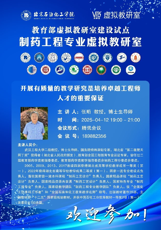 2025年4月12日晚,我校牽頭的教育部制藥工程專業(yè)虛擬教研室舉辦線上學(xué)術(shù)報(bào)告會(huì),武漢工程大學(xué)張珩教授作題為《開展有質(zhì)量的教學(xué)研究是培養(yǎng)卓越工程師人才的重要保證》的主旨報(bào)告。報(bào)告會(huì)由我校教務(wù)處處長(zhǎng)王騰主持,全國(guó)150余名高校教師云端參會(huì),共議制藥工程專業(yè)工程教育改革方向。