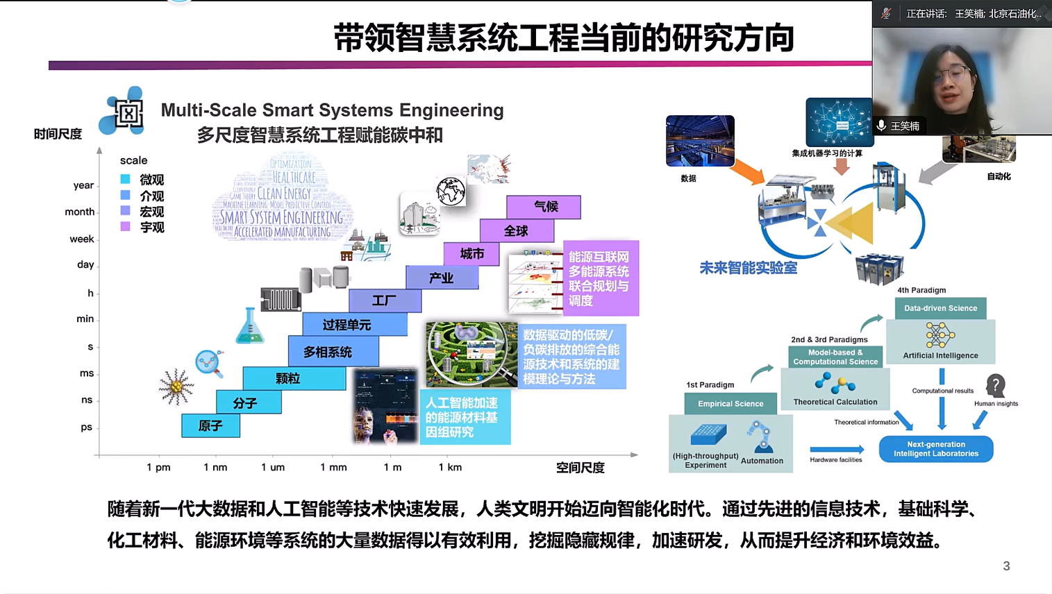 王笑楠老師從智慧系統(tǒng)工程當前的研究方向為起點,介紹了當前化工材料研發(fā)的難點和痛點問題,提出了能源化工材料賦能碳中和的研究思路,進而介紹了人工智能發(fā)展過程及智能技術(shù)新進展助力各個研究領(lǐng)域的發(fā)展動態(tài)。報告中,王笑楠老師提出,當前人工智能和科學(xué)融合面臨重大機遇和挑戰(zhàn),AI for Science有望成為我國化工、材料、生物等領(lǐng)域突破“卡脖子”困境和實現(xiàn)彎道超車的重大機遇。王笑楠老師介紹了其研究團隊在機器學(xué)習(xí)指導(dǎo)下的膜材料設(shè)計合成、CO2分離和捕集聚合物膜的計算模擬、AI設(shè)計高效CO2/N2分離膜以及機器學(xué)習(xí)指導(dǎo)下的聚酰胺納濾膜的合成等方面的原創(chuàng)性研究工作。此外,王老師簡要介紹了清華大學(xué)Al + Chemical Engineering專業(yè)建設(shè)情況。