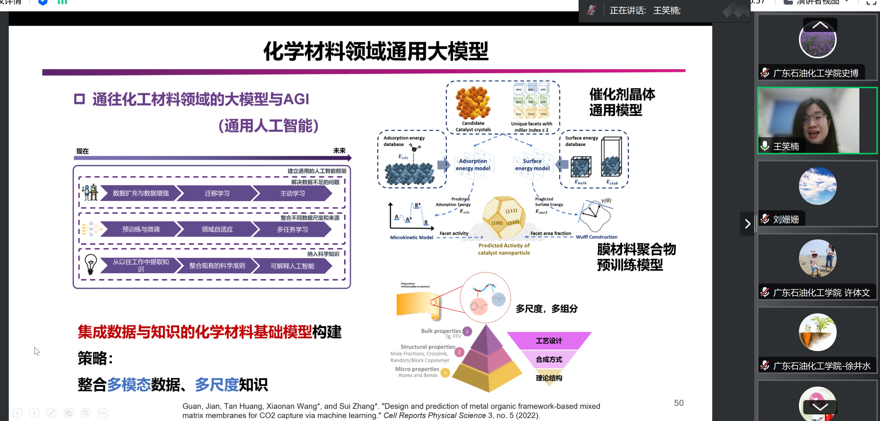 在隨后的交流環(huán)節(jié),與會的老師們積極提問,提出了AI技術(shù)指導(dǎo)材料設(shè)計合成、AI技術(shù)如何更好的進入學(xué)生課堂、AI數(shù)據(jù)庫建設(shè)等多方面的問題,王笑楠教授一一進行解答,線上研討氣氛熱烈。老師們紛紛表示,通過此次活動,不僅拓寬了視野,還加深了AI對科學(xué)研究和教學(xué)工作賦能的理解。