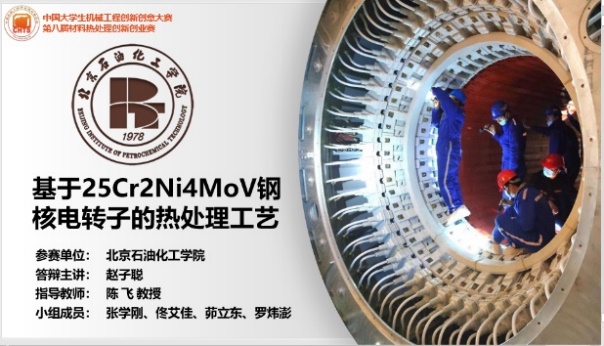 由學院陳飛教授指導,趙子聰(材研20)、張學剛(材研20)、佟艾佳(材191)、茆立東(材201)、羅煒澎(材191)5位同學組成的代表隊,憑借分組賽作品《AZ91D合金表面IL-GO/HA/MAO復合膜層的制備及耐蝕性研究》入圍全國總決賽。在總決賽中,團隊以《基于25Cr2Ni4MoV鋼核電轉子的熱處理工藝》為題,對核電轉子的應用背景及技術要求進行分析,對選擇材料、制造流程、熱處理工藝規范、設備選擇、熱處理質量檢驗等內容進行介紹,最終憑借出色的表現榮獲大賽研究生組二等獎。