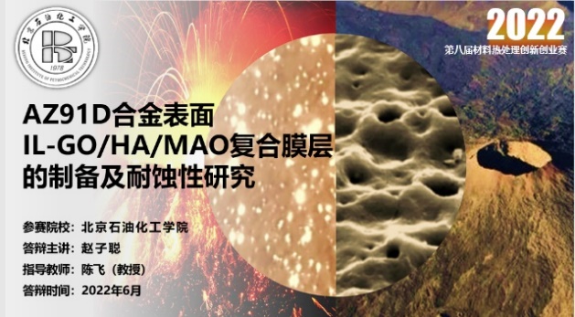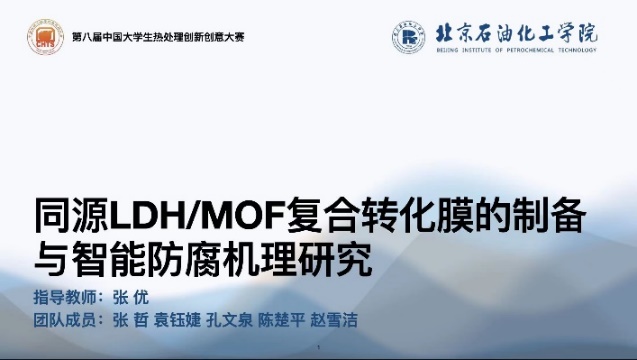 由學院張優副教授指導,張哲(材研21)、袁鈺婕(材研21)、孔文泉(材研21)、陳楚平(材研20)、趙雪潔(材研20)5位同學組成的另一支代表隊以作品《同源LDH/MOF復合轉化膜的制備與智能防腐機理研究》榮獲大賽研究生組三等獎。