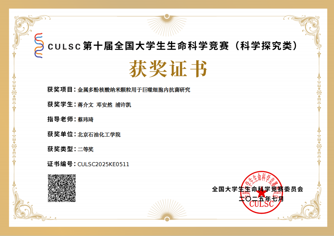 近日,“飛域杯”第十屆全國大學生生命科學競賽(科學探究類)全國總決賽順利收官。此次賽事吸引全國多所高校兩萬余支隊伍參與,我校新材料與化工學院制藥工程系組織的參賽團隊取得優異成績,斬獲北京賽區一等獎1項、二等獎1項、三等獎4項。其中蔡瑋琦老師指導生物制藥專業23級本科生蔣介文、鄧安然、浦許凱等同學的參賽項目榮獲北京市一等獎、國家級二等獎,實現我校參加該賽事國家級獎項的新突破。