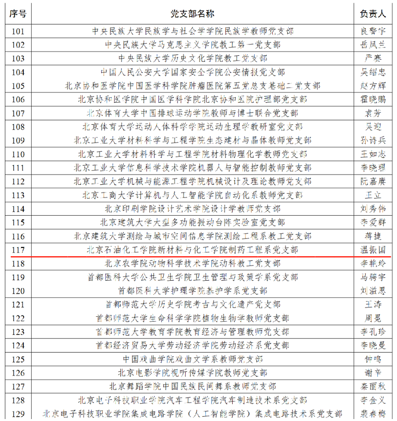 新材料與化工學院黨委扎實開展“雙帶頭人”工作室培育創建和“強國行”專項行動。制藥工程系黨支部2023年榮獲北京市高校先進基層黨組織稱號。2024年教師黨支部“藥心融合工作法”獲評學校優秀黨支部工作法。