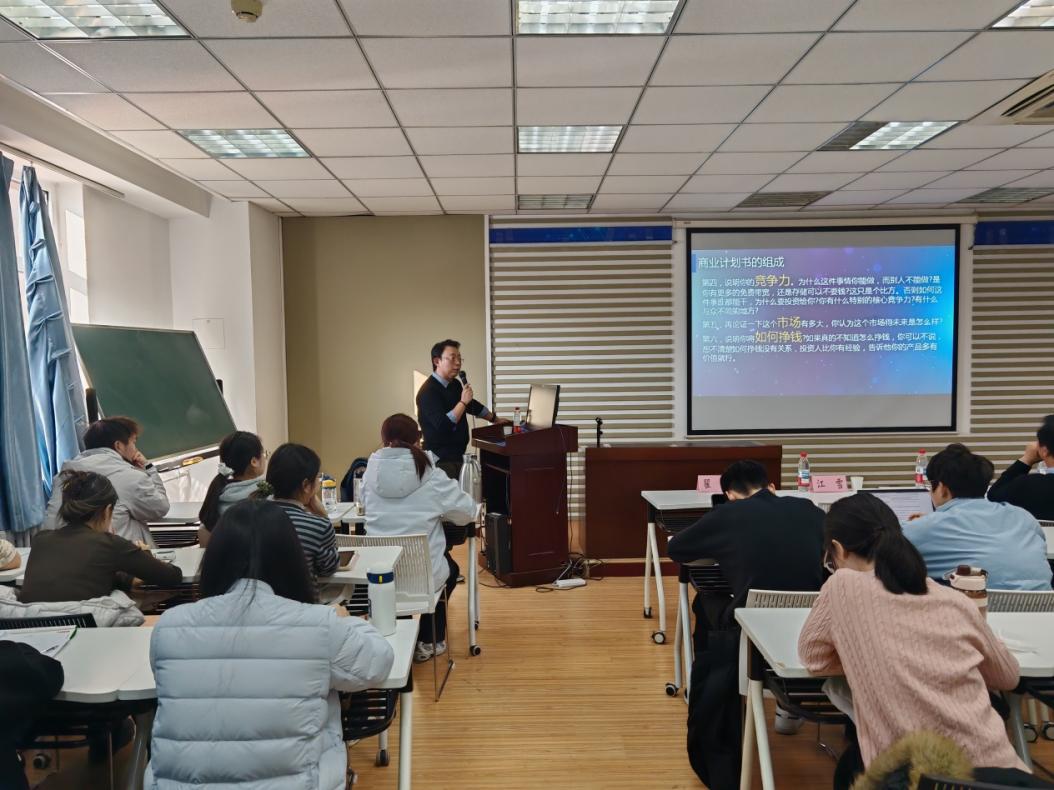 翟彬老師圍繞創業者和創業團隊構建、商業計劃書編寫要點展開闡述,系統梳理了從商業計劃書撰寫到項目路演的全流程關鍵環節。他特別針對專業碩士的創業路徑,提出了“先歷練、再創新、后創業”的務實建議。翟老師強調,一份成功的商業計劃書必須精準回答“市場空白、解決方案、目標用戶、核心競爭力、市場規模、盈利模式”等十大核心問題,并指出“為什么這件事你能做,而別人不能做”這一問題的答案,是構建項目護城河、吸引投資者的關鍵所在。在路演環節,他提示創業者應圍繞“宏大愿景、資金使用計劃、競爭力展示、團隊實力、痛點解決能力”五大要素展開論述,用精準數據和飽滿狀態打動投資人。