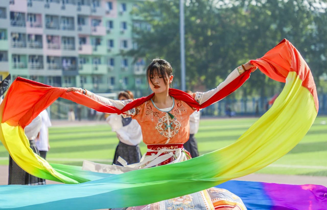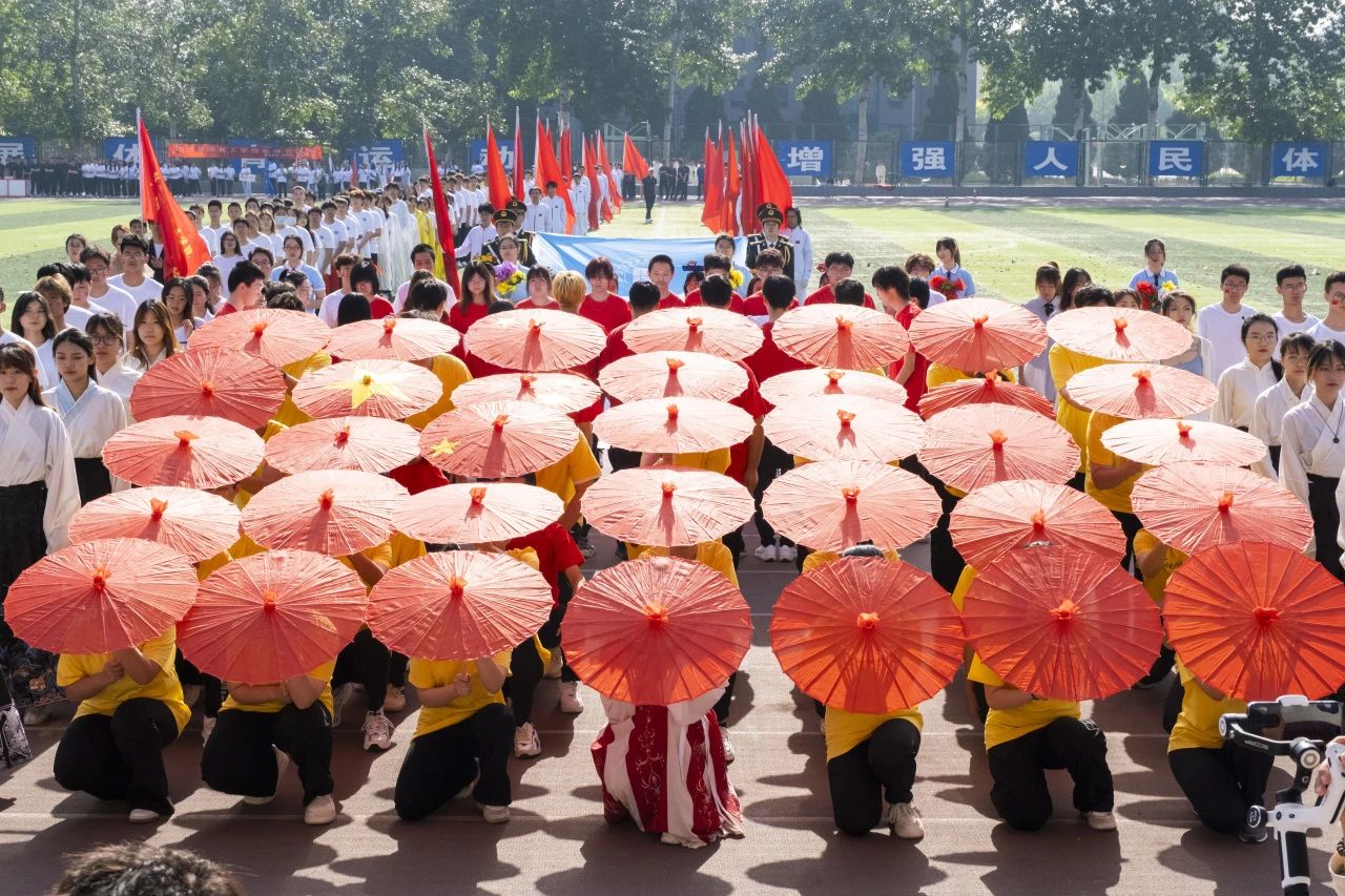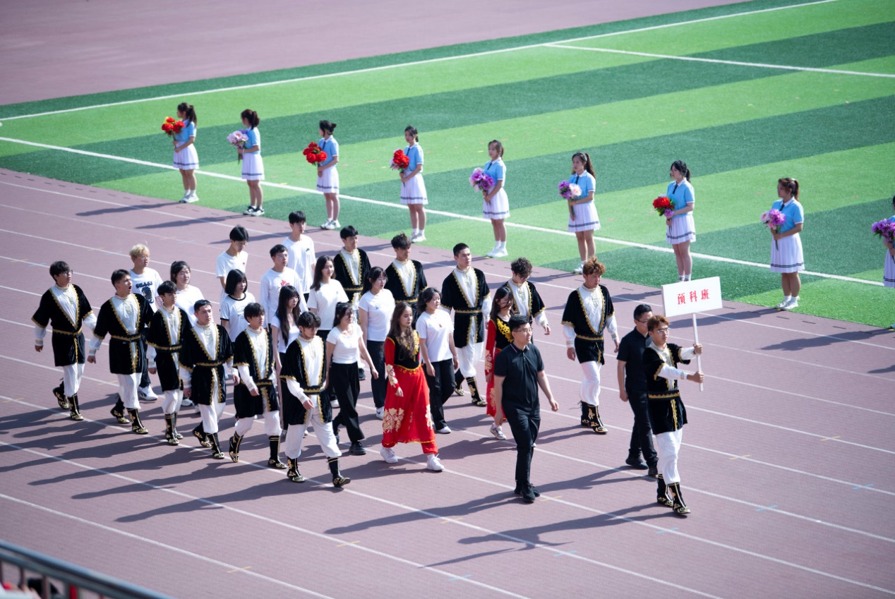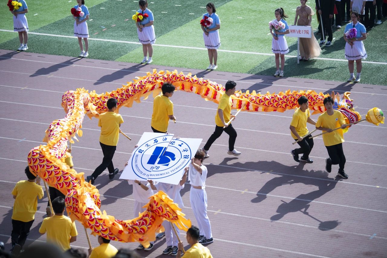 伴隨著昂揚的樂曲,國旗班、紅旗方陣、花束隊方陣以及各教學院系學生組成的方隊先后入場。嘹亮的口號聲,各具特色的方隊表演充分展現了北石化學子的精神風貌。