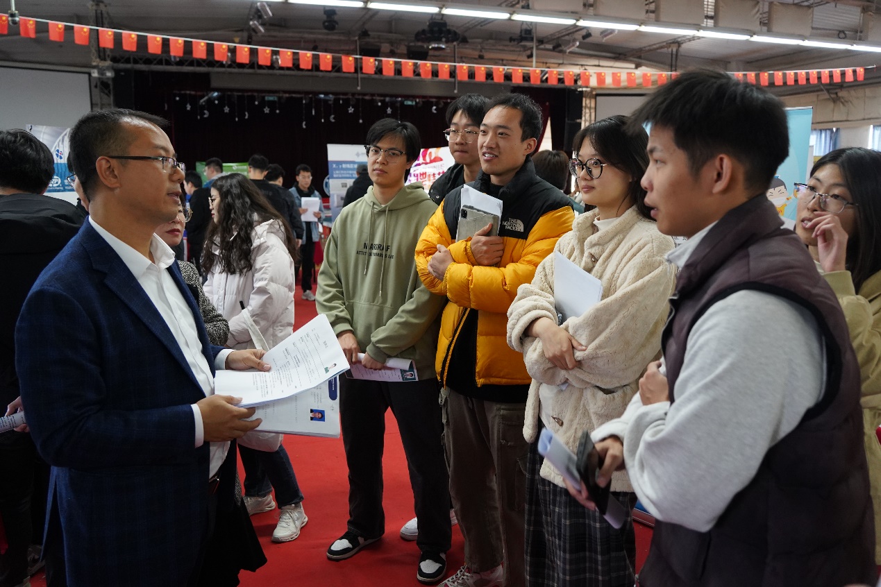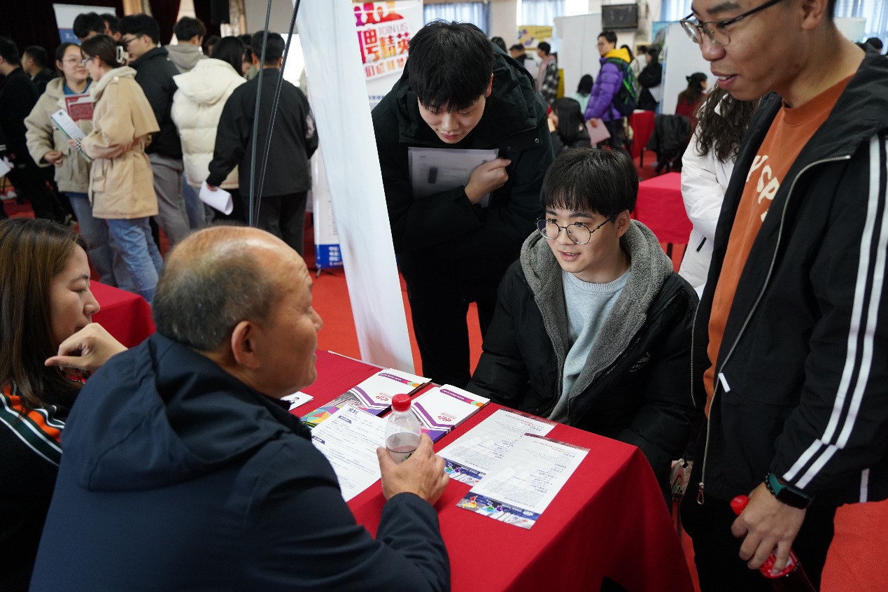 畢業生手持簡歷穿梭在招聘展位前,尋找心儀崗位,招聘人士與學生熱情交流。