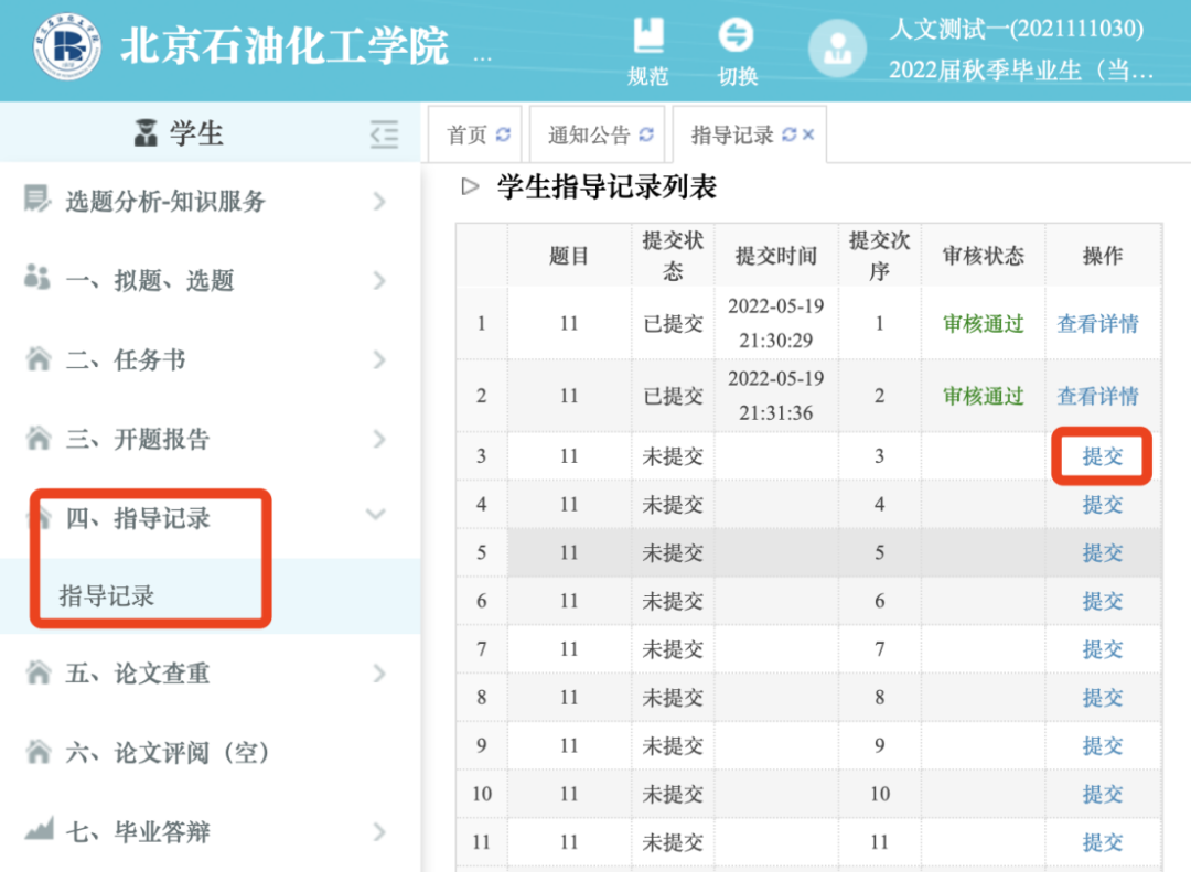 請各位同學按提交次序填寫并提交指導記錄,通過記錄指導過程對畢業設計(論文)內容進一步梳理總結,加深對知識的理解。