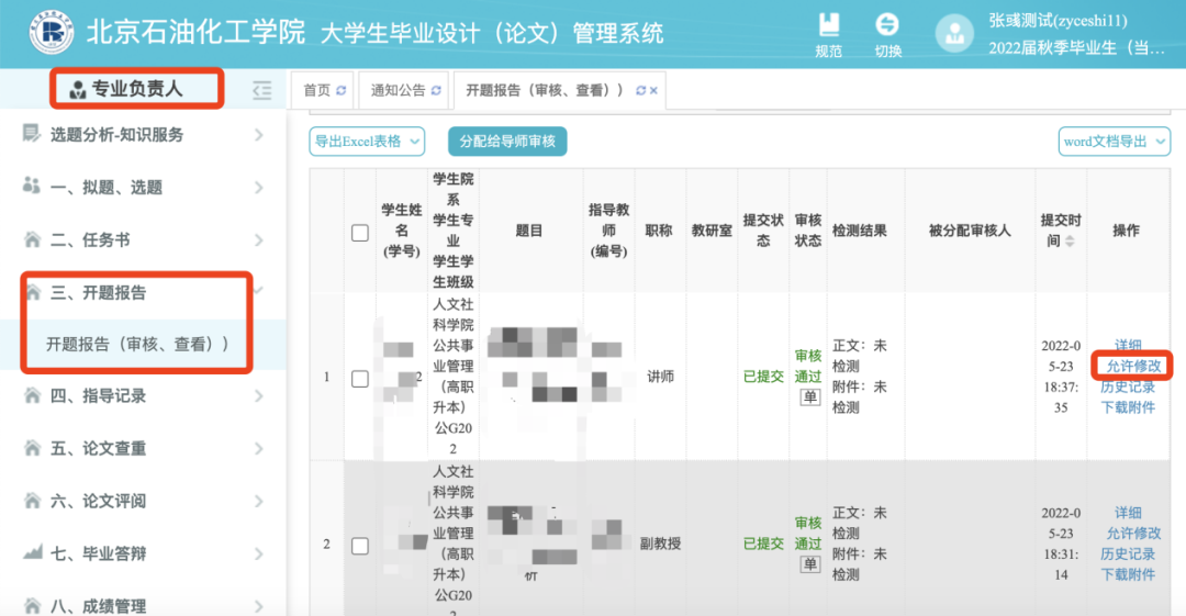 若學生提交的開題報告審核通過后,有修改需求,請聯系專業負責人點擊“允許修改”即可在系統修改開題報告。