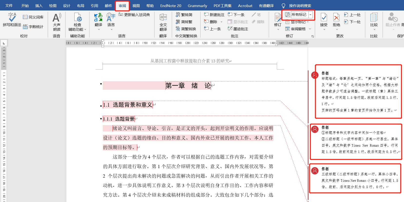 文件下載后,請用Word打開《開題報告格式-2023版》、《畢業設計撰寫模板-2023版》文檔,并打開[審閱]菜單下的[所有標記]選項,具體的格式要求見文檔右側的標注。