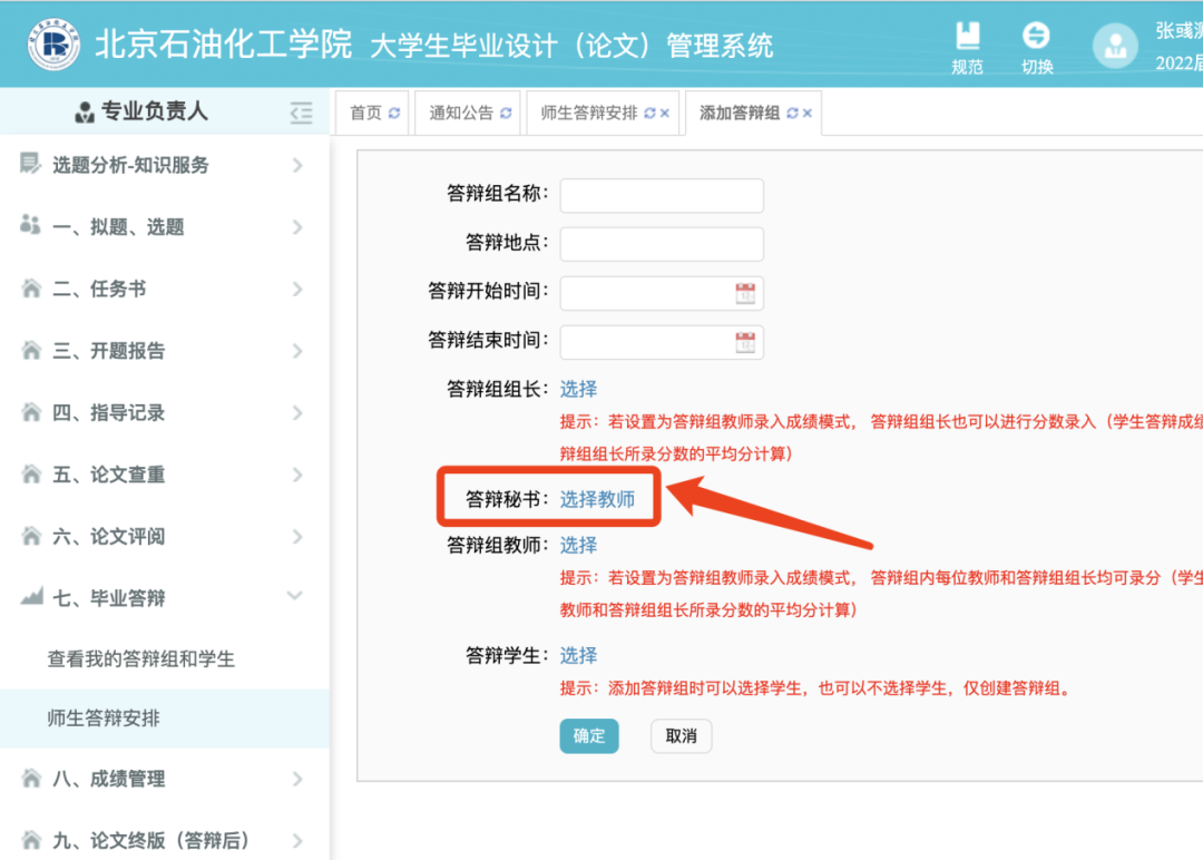 “答辯秘書”由專業負責人在錄入答辯分組時設置,專業負責人在“專業負責人”角色—“畢業答辯”—“師生答辯安排”中錄入答辯分組,明確各答辯小組組長、成員、答辯秘書和學生分組名單,并確定網絡答辯平臺。