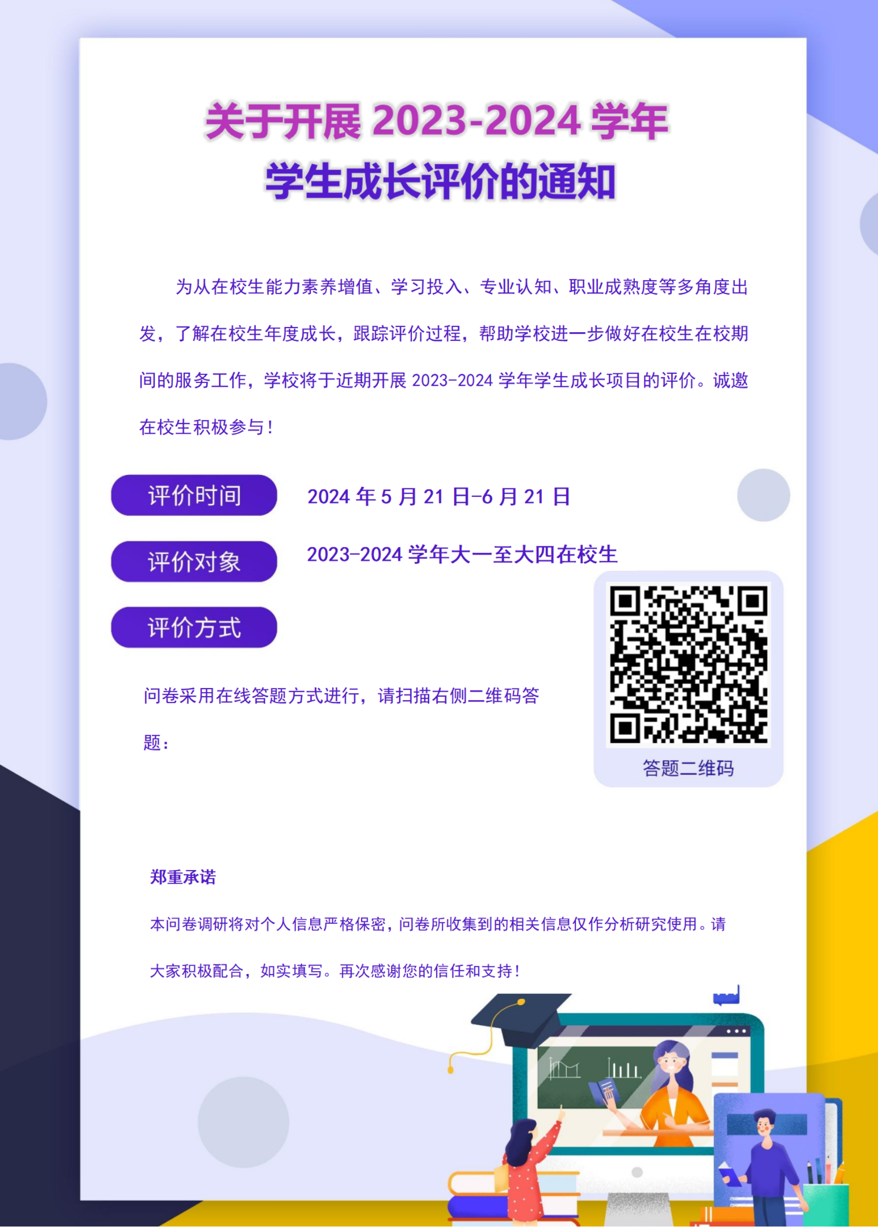 為從在校生能力素養增值、學習投入、專業認知、職業成熟度等多角度出發,了解在校生年度成長,跟蹤評價過程,幫助學校進一步做好在校生在校期間的服務工作,學校決定開展 2023-2024學年學生成長項目的評價。誠邀在校生積極參與!