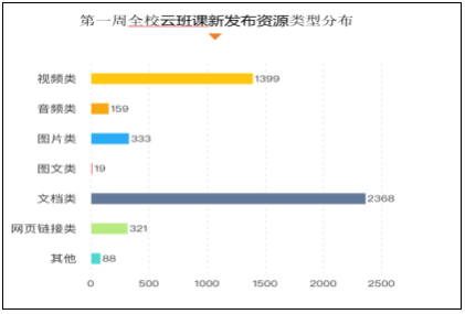 2019-2020學年春季學期第一周全校云班課新發布資源4687個,豐富的教學資源為線上教學活動提供了有力支撐。