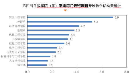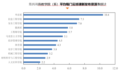 5、第四周各教學院(系)的課均活躍指數在91.8-288.3之間,全校平均每門云班課活躍指數167.6。