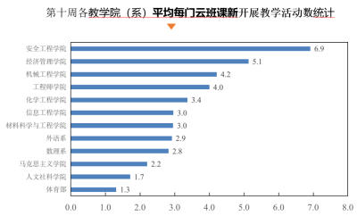 第10周各教學院(系)的課均新開展活動在1.3-6.9之間,全校平均每門云班課新開展活動數3.3。