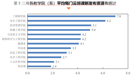 2、第十三周各教學院(系)的課均新發布資源在1.9-7之間,全校平均每門云班課新發布資源數4.1。