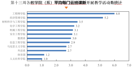 3、第十三周各教學院(系)的課均新開展活動在1-6之間,全校平均每門云班課新開展活動數3.1。