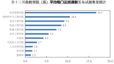 4、第十三周各教學院(系)的課均新發布試題在1.3-16.7之間,全校平均每門云班課新發布試題數6.3。