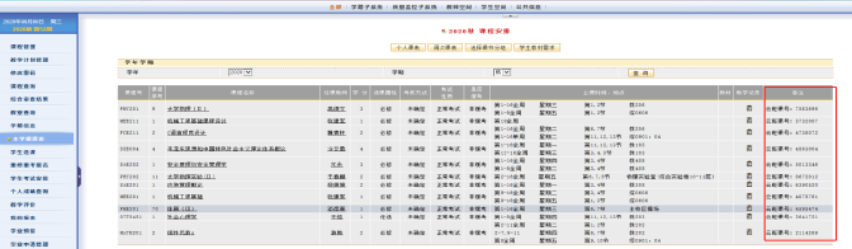 3.登錄學(xué)校教務(wù)在線系統(tǒng)(http://m.nmhtqm.com/pub/jwc/index.htm),點(diǎn)擊“本學(xué)期課表”,在備注項(xiàng)查看所選課程的云班課號。