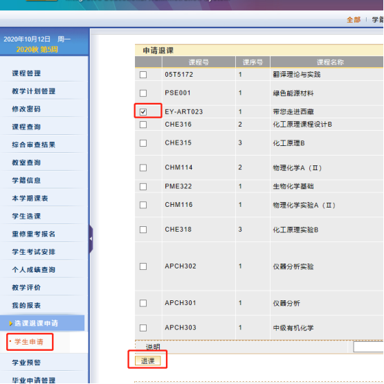 2、 在學(xué)生選課申請(qǐng)頁(yè)面,首先找到你要退課的教學(xué)班,點(diǎn)擊前面的復(fù)選框,然后點(diǎn)擊退課。