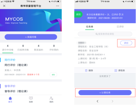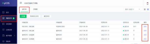 3.認(rèn)領(lǐng)任務(wù)。我們根據(jù)課程類型設(shè)計(jì)了五種評(píng)價(jià)問(wèn)卷,分別對(duì)應(yīng)理論課、思政課、實(shí)驗(yàn)課、實(shí)踐課、體育課的評(píng)價(jià),可根據(jù)需要選擇相應(yīng)的評(píng)價(jià)問(wèn)卷,然后點(diǎn)擊右側(cè)【評(píng)價(jià)】進(jìn)行認(rèn)領(lǐng)任務(wù)。如圖3所示。
