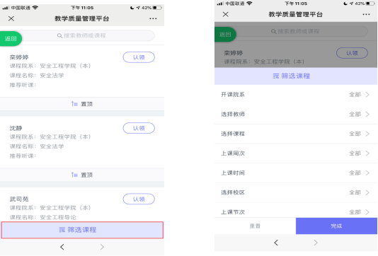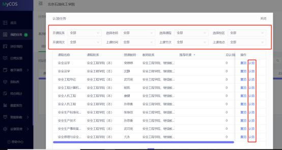 認(rèn)領(lǐng)任務(wù)彈窗中可以通過(guò)“開(kāi)課院系”、“教師”、“課程”、“開(kāi)課周次”、“上課時(shí)間”、“上課節(jié)次”等條件進(jìn)行課程的篩選或搜索。如圖 4所示。