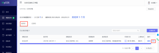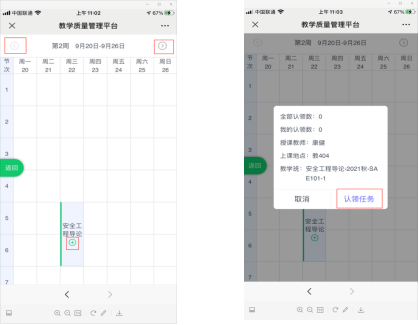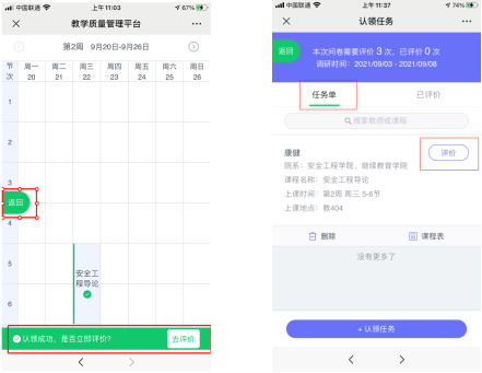 在選中的課程右上方點(diǎn)擊【認(rèn)領(lǐng)】,就會(huì)彈出該課程的課表信息,如圖13,點(diǎn)擊左右箭頭可以選擇周次,最左列是該課程的節(jié)次信息,點(diǎn)擊課程名稱下的【+】會(huì)顯示該課程的上課具體信息,如圖14,確認(rèn)后點(diǎn)擊【認(rèn)領(lǐng)任務(wù)】,認(rèn)領(lǐng)成功后可立即評(píng)價(jià),也可點(diǎn)擊【返回】進(jìn)入任務(wù)單頁(yè)面,從任務(wù)單中進(jìn)行評(píng)價(jià),圖15。