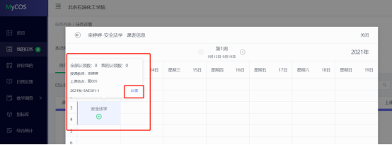 選擇相應(yīng)課程點(diǎn)擊右側(cè)【認(rèn)領(lǐng)】,便會(huì)彈出該門(mén)課程的課表信息,如圖5所示,選擇具體上課時(shí)間點(diǎn)擊【+】添加或點(diǎn)擊認(rèn)領(lǐng)后即認(rèn)領(lǐng)成功,