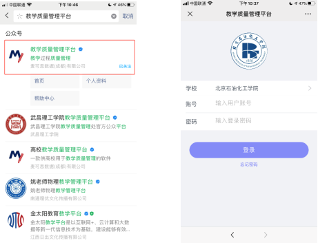 1.微信端平臺(tái)登錄。微信搜索公眾號(hào)“教學(xué)質(zhì)量管理平臺(tái)”,關(guān)注后,點(diǎn)擊【首頁(yè)】,輸入學(xué)校名稱,用戶名和密碼(賬號(hào):教師工號(hào),初始密碼:111111),即可登錄。如圖10所示。