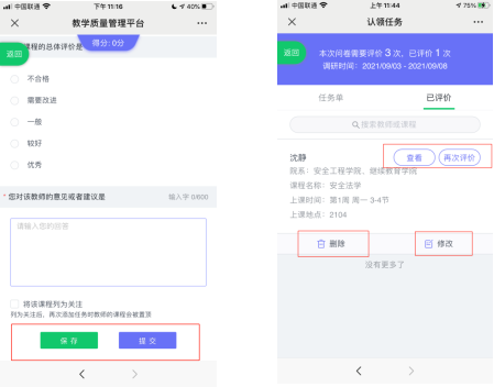 評(píng)教問(wèn)卷提交后,可在【我的任務(wù)】—【已評(píng)價(jià)】列表中查看、修改、刪除評(píng)價(jià)結(jié)果。