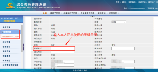 教師用戶:登錄教務(wù)在線-點(diǎn)擊【教師管理】-點(diǎn)擊【教師修改個(gè)人信息】-在【聯(lián)系電話】一欄輸入本人正常使用的手機(jī)號碼-點(diǎn)擊【保存】