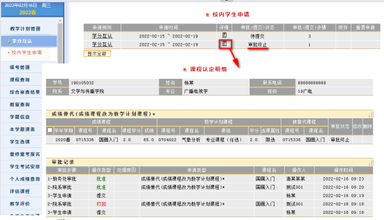 該學生的學分互認申請審批全部通過后,該學生的申請審批狀態(tài)將變更為“審批終止”。點擊詳情查看課程認定明細。