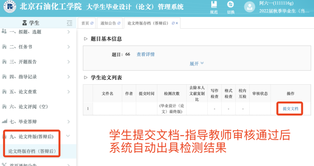 答辯結(jié)束后,各位同學(xué)應(yīng)根據(jù)答辯組意見(jiàn)修改畢業(yè)設(shè)計(jì)(論文),修改后的論文需在系統(tǒng)“論文終版(答辯后)--論文終版存檔(答辯后)”提交論文終稿,經(jīng)指導(dǎo)教師審核通過(guò)后系統(tǒng)自動(dòng)出具論文檢測(cè)結(jié)果。