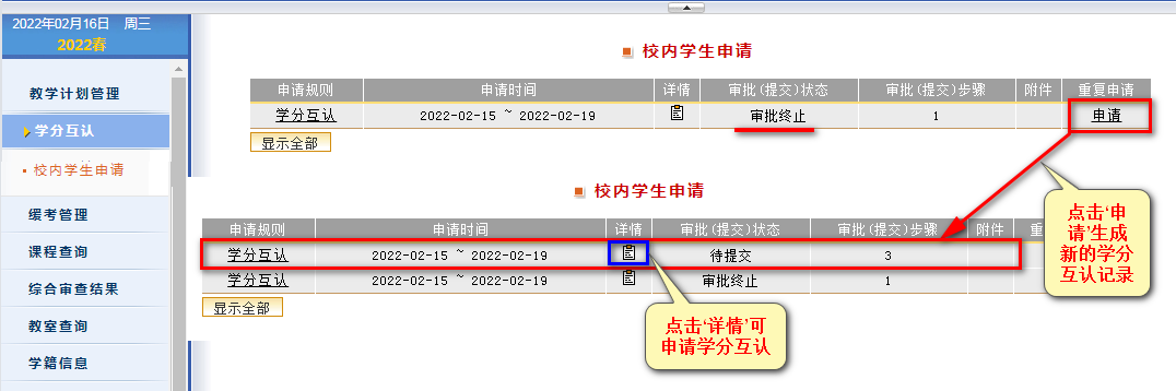 另外,學(xué)分互認(rèn)申請(qǐng)被“打回”或“審批終止”后,學(xué)生可在此申請(qǐng)規(guī)則下再次提交申請(qǐng),但一經(jīng)審批后不允許撤銷。