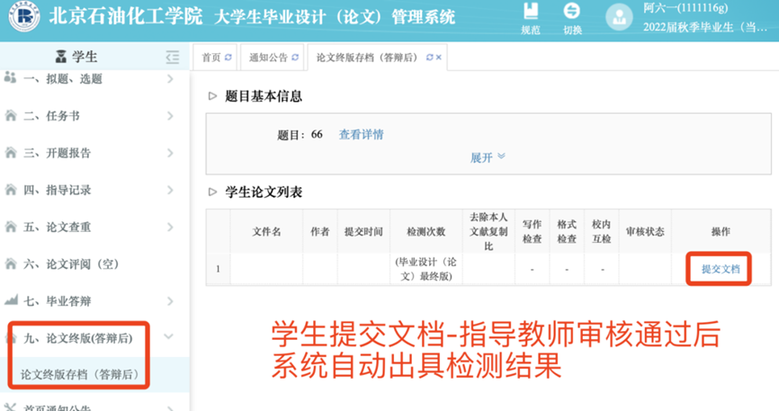 登陸系統后,在“論文查重--論文查重(答辯前)”模塊上傳畢業設計(論文)定稿,指導教師“審核通過”后,系統自動出具檢測結果。