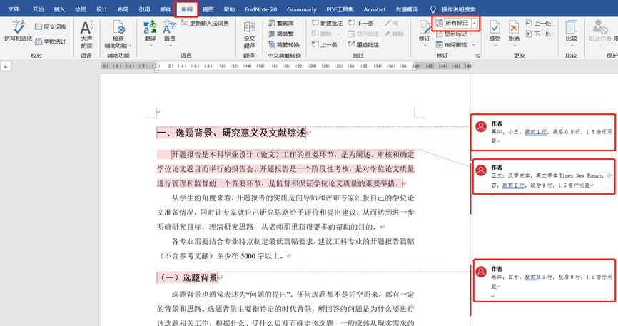 文件下載后,請用Word打開《開題報告格式》、《畢業設計撰寫模板》文檔,并打開[審閱]菜單下的[所有標記]選項,具體的格式要求見文檔右側的標注。