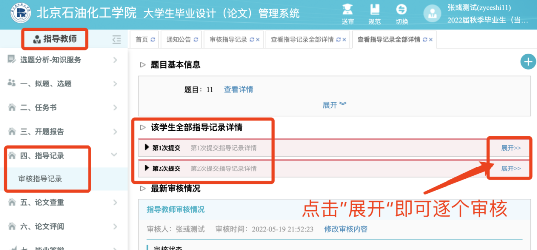 由同學填寫,再由指導教師審核。整個畢業設計(論文)環節學生應提交不少于16次指導記錄,教師需在知網畢設管理系統“指導記錄--審核指導記錄--全部詳情”中逐個審核。