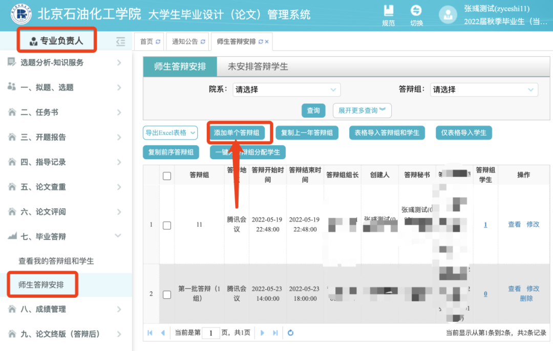 “答辯秘書”由專業負責人在錄入答辯分組時設置,專業負責人在“專業負責人”角色—“畢業答辯”—“師生答辯安排”中錄入答辯分組,明確各答辯小組組長、成員、答辯秘書和學生分組名單,并確定網絡答辯平臺。