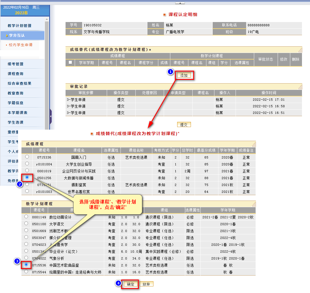 學生端: 登錄教務在線個人賬戶,點擊學分互認-校內學生申請,選擇相應的替代項目