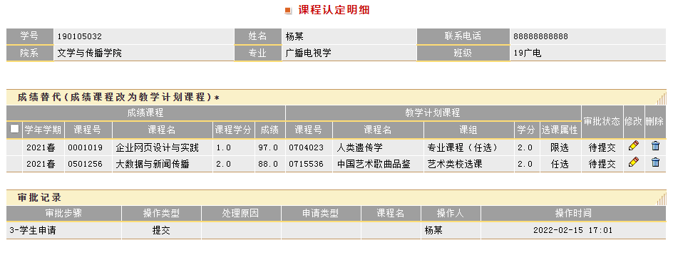 該學生的學分互認申請審批全部通過后,該學生的申請審批狀態將變更為“審批終止”。點擊詳情查看課程認定明細。審批終止后,將同步修改該學生的個人教學計劃及相關成績。
