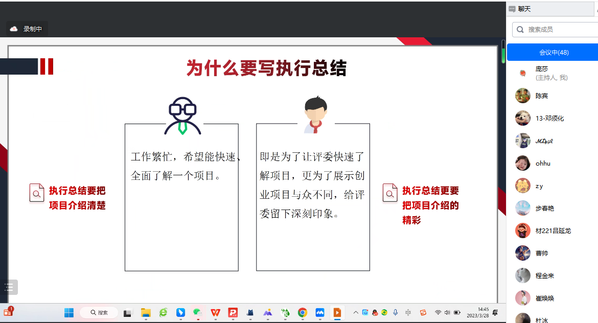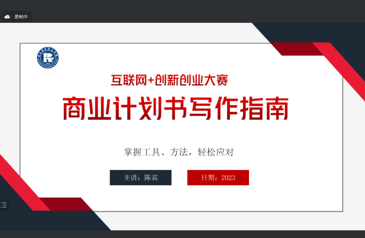 陳老師從用戶洞察、問題描述、機會識別、市場定位、產品服務、商業模式、營銷策略、發展規劃、融資方案、團隊介紹幾個方面重點介紹了商業計劃書的10個結構。通過大量的案例和同學們分享了商業計劃書的撰寫原則。此外,陳老師還根據自己多年經驗,結合案例和同學們分享了路演VCR制作的重要性和細節提示。