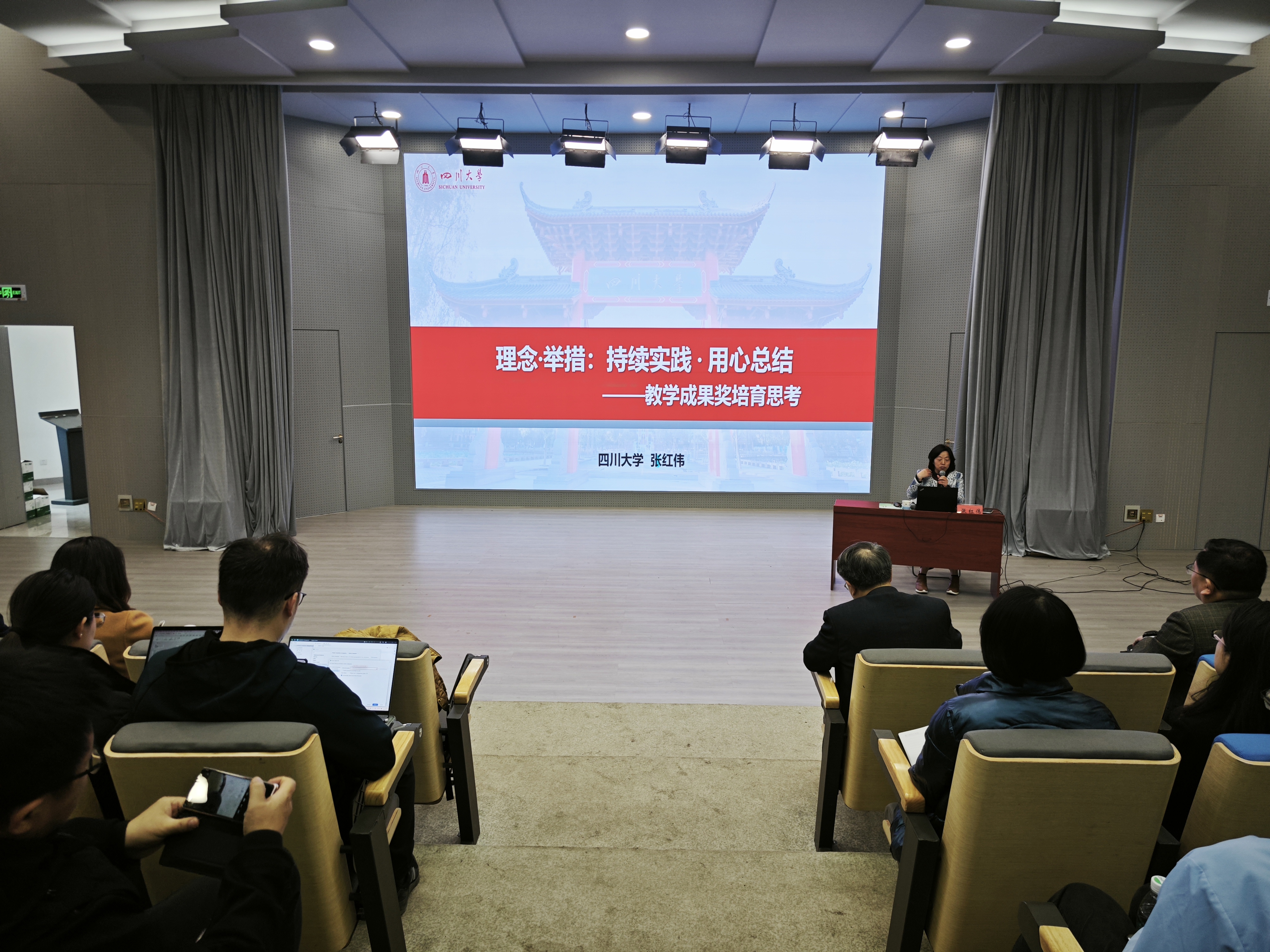 張紅偉教授以“理念?舉措:持續(xù)實踐?用心總結——教學成果獎培育思考”為題,分別從教學管理者的角度及一線教師的角度出發(fā),對教學成果的內涵、孵化、總結、申報、案例等方面進行分享介紹,總結了教學成果獎的培育方法與技巧。她表示,國家級教學成果獎是我國教育教學領域的最高榮譽,在教育教學領域意義重大、影響深遠,對學校事業(yè)發(fā)展和教師個人成長均具有深遠價值。張紅偉教授談到,教學成果是做出來的,不是寫出來的,教師們要通過做深做實做好教改項目,探索教育教學規(guī)律,創(chuàng)新教育教學方法,提煉出具有創(chuàng)新性、實用性和推廣性的教學成果,運用嚴謹的科學態(tài)度和嚴密的邏輯思維,總結打磨教學成果。張紅偉教授還以國家級教學成果特等獎“以課堂教學改革為突破口的一流本科教育川大實踐”和國家級教學成果二等獎“以卓越學術為引領的研究型大學教師教學發(fā)展模式的構筑與實踐”為例,現場演示了從選題定位、成果積淀到文本打磨的全流程實踐圖譜。她既有理論高度又接地氣的指導,把復雜的教學成果轉化為可操作的步驟,為參會教師提供了可復制、可操作的申報范式,真正打通了教科研“最后一公里”。