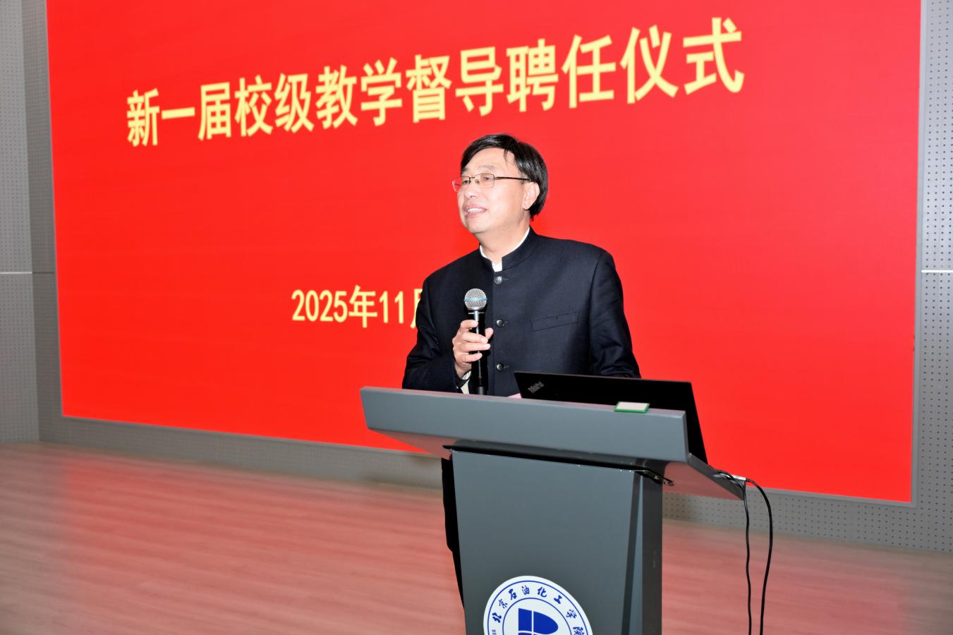 王騰處長回顧了上一屆校級教學督導的重點工作及成效情況,代表教務處對上一屆教學督導的辛勤付出及重要貢獻致以崇高的敬意和感謝,并宣讀了《北京石油化工學院關于調整校級教學督導組成員的通知》(北石化院發〔2025〕13號)文件,宣布學校新一屆校級教學督導組專家名單。隨后,羅學科校長為新一屆校級督導專家頒發聘書并合影留念。