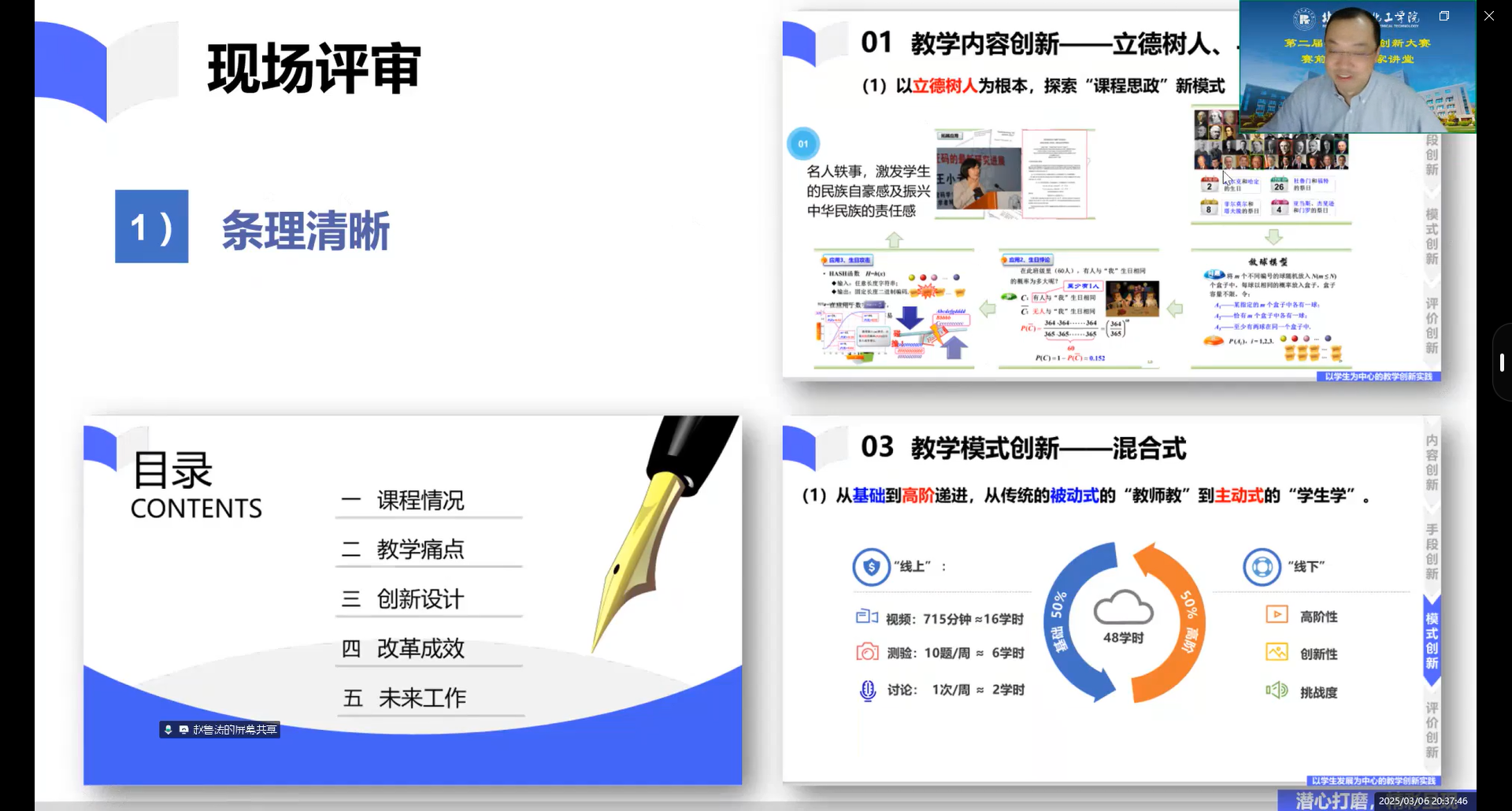 趙教授的講座題目為“潛心打磨,精彩呈現——教創賽備賽建議”,內容豐富且實用。首先,他向教師們介紹了教學創新大賽的基本情況,并分享了自己當年參賽時的十五分鐘教學創新設計匯報,讓教師們對大賽有了更直觀的認識。接著,趙教授詳細講解了教學創新成果報告的設計與撰寫方法,從課程簡介、學情與問題分析、創新理念與思路、創新舉措、成效輻射等五個方面進行了闡述,為教師們提供了清晰的思路和方向。