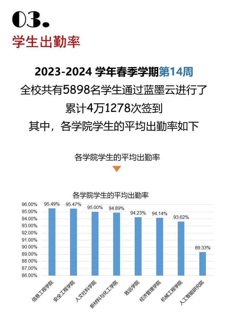 » 2023-2024學(xué)年春季學(xué)期第十四周藍(lán)墨云到課率統(tǒng)計數(shù)據(jù)