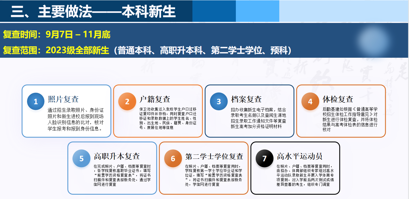 2023年的新生復查工作從9月7日新生入學開始,到11月末基本結束。期間教務處、研究生處、各招生學院、各相關部門準確把握了新生入學資格復查的重點環節,通過嚴查電子檔案、比對錄取通知書、照片、身份證件等重要信息的方式,核實新生入學資格和信息,完成學籍電子注冊工作。學校建立了審查人員、復核人員、部門負責人審簽機制,真真正正做到了件件有落實。對個別學生提供的材料不全或有疑問的,加強查驗、迅速核實,及時匯報,堅決杜絕冒名頂替、弄虛作假、學籍學歷違規行為的發生。