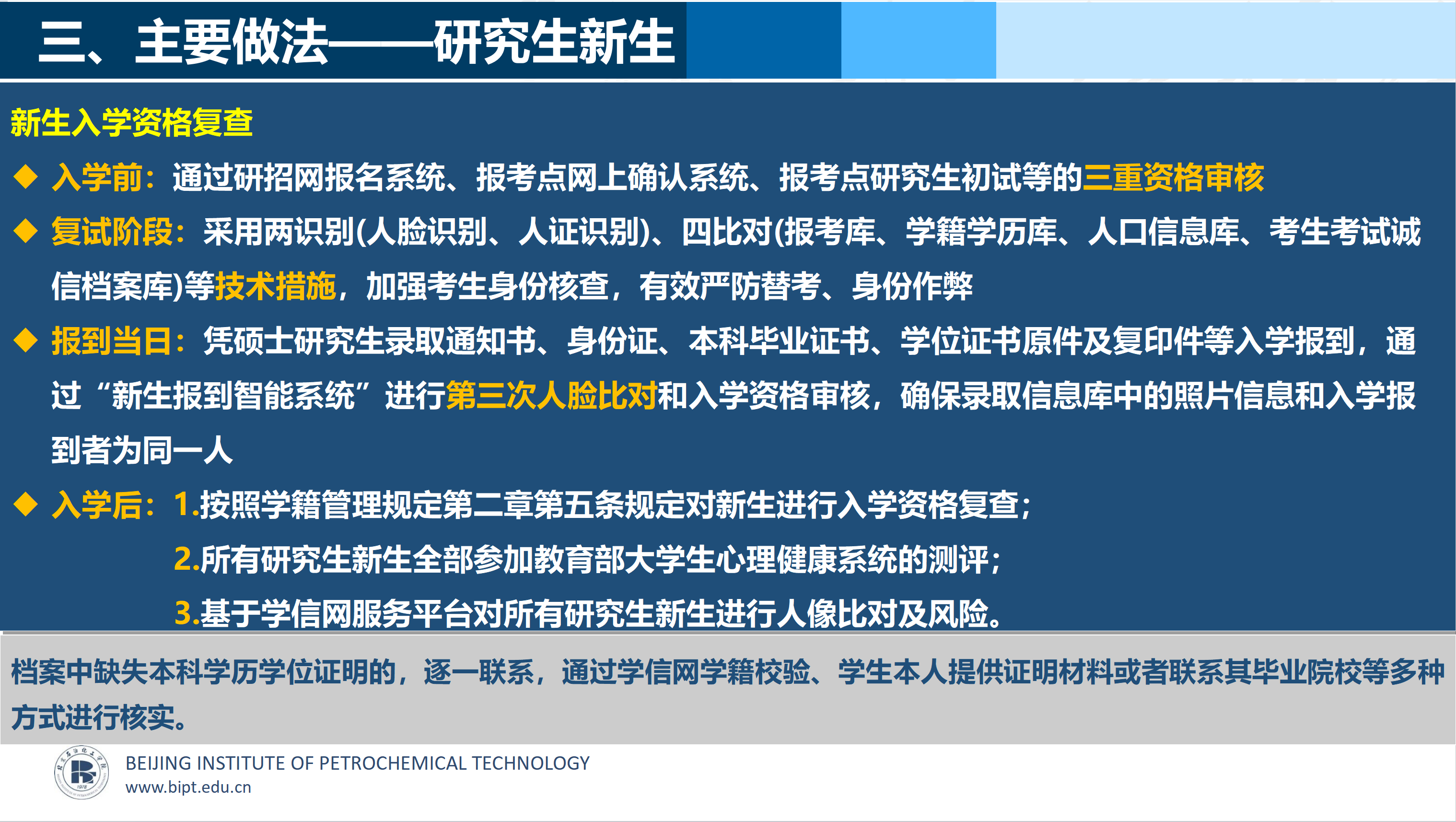 根據《普通高等學校學生管理規定》(教育部令第 41 號)、《高等學校學生學籍學歷電子注冊辦法》(教學〔2014〕11 號)、《教育部辦公廳關于做好 2020 年普通高等學校錄取新生入學資格復查和學籍電子注冊工作的通知》和教育部防范長效機制文件的要求,結合《北京石油化工學院學生學習管理規定(2023版)》(北石化院發〔2023〕76號)、《北京石油化工學院研究生學籍管理規定(2017年修訂版)》(北石化院發〔2017〕95號)等文件要求,我校嚴格按照國家對新生錄取通知、招生政策規定和學籍管理規定,認真開展新生入學資格復查。