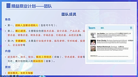 接著,從國賽專家構成資質、國賽評審規則等方面切入,明確投資人評估項目的關注點包括“想法”“產品”“團隊”“執行”四個方面,因此,一個成功的創新創業項目=好的想法+創新產品+優秀團隊+強有力的執行。進一步地提出商業計劃書撰寫十要素的核心邏輯,并以歷年國賽金獎、銀獎等優秀項目為例解析各個要素的精髓是什么、如何撰寫出好的商業計劃書、常用的商業計劃書撰寫工具等。